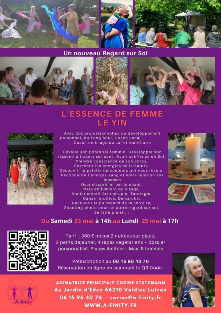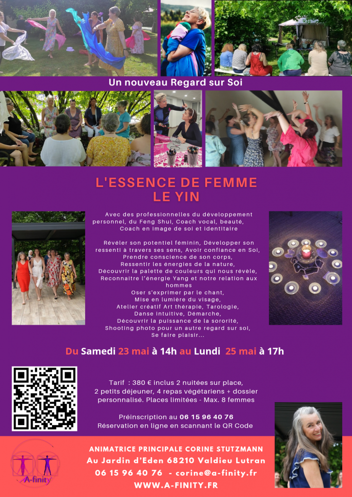 Programme sur 3 jours : Dans un cocon de bienveillance, Rencontre avec vous-même et son féminin. Révélez la beauté du « Yin » et l’offrir telle une coupe remplie d’amour. Osez être enfin la femme que vous avez toujours voulu être. Reconnaitre l’énergie Yang et votre relation aux hommes. Découvrir le subtil à travers ses sens La relation à notre corps et à notre image.